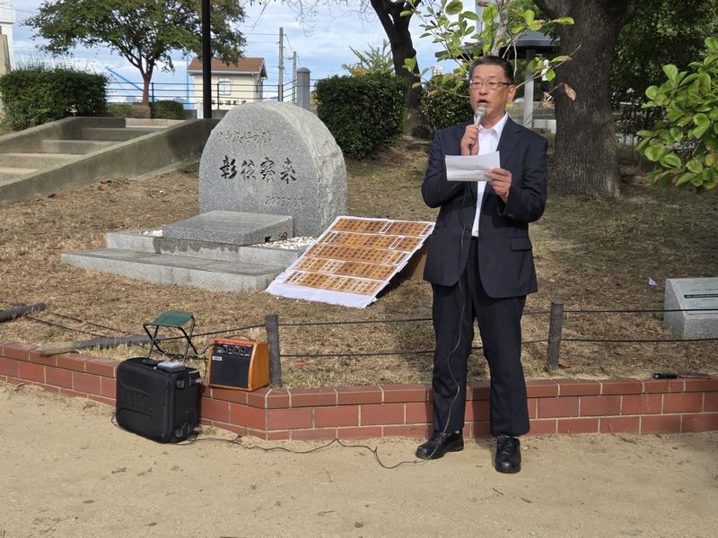 10/11(土)、大阪港天保山公園にある《日中友好“彰往察来”追悼記念碑》前で第28回(中国人強制連行犠牲者)追悼会が開催された。