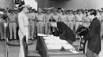 写真は重光葵(しげみつ・まもる)外務大臣が署名している場面、このあと大本営を代表して梅津美治郎(うめづ よしじろう)が署名した(梅津は極東裁判で無期判決)。