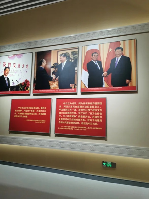 見物者が多かった「中日関係と平和友好」の展示コーナー(上掲、石破首相と習近平主席の握手をする写真が展示してあるコーナー)