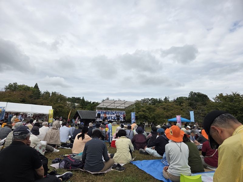 中央、集会メイン舞台 舞台後方1kmの山並みに祝園弾薬庫がある