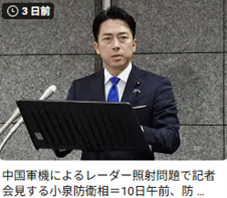 それともう一つ疑問点がある。小泉防衛相は「断続的なレーダー照射」と言う言葉を繰り返している。二つのレーダー照射の特徴は、火器管制レーダーは一点集中の「持続的安定的」な照射で、捜索用レーダーは広範囲に「断続的」な照射ということだ。小泉防衛相は「断続的な照射」と言っていることから、自衛隊機が受けたのは「捜索用レーダー」ではないのか?長時間にわたって受けたのは回避行動をとらず、中国軍機の訓練の周辺をウロウロしていたということではないのか?海上衝突回避規範(CUES)によれば、火器管制レーダー照射を受けた場合は、自艦・自機の安全のために速やかに回避行動を取る(進路と速度を大きく変えること)とされている。30分もレーダー照射を受け続けたというのであれば、回避行動をとらなかったということだ。それは火器管制照射ではなかった、あるいは危険な照射とは考えなかったからではないのか?それとも命がけで中国軍を挑発していたのだろうか?