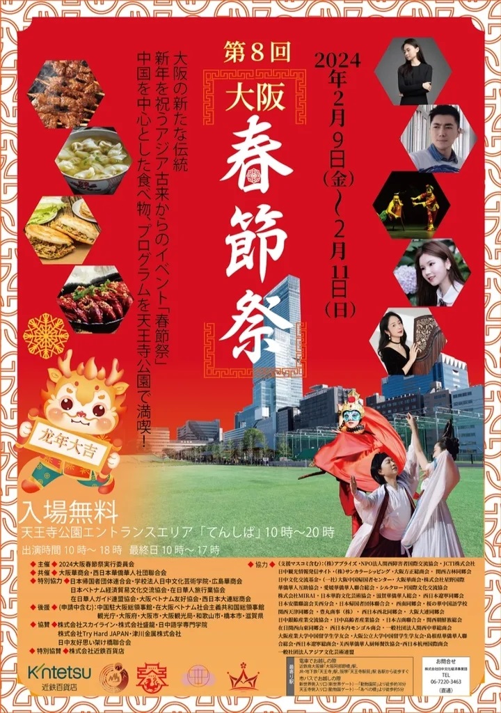 日本でも元々は、正月と言えば春節(旧正月)に新年の祝いをした。中国を始めアジアの国々では今でも春節に正月を祝う。“2024大阪春節祭”は、同実行委主催のもと、大阪駐在の中国総領事館やベトナム総領事館が後援するなどアジアの伝統を体現した華やかな祭典となった。この他、大阪府市をはじめ関西の行政機関などが後援し、多くの友好団体や企業の協賛協力で開催された。