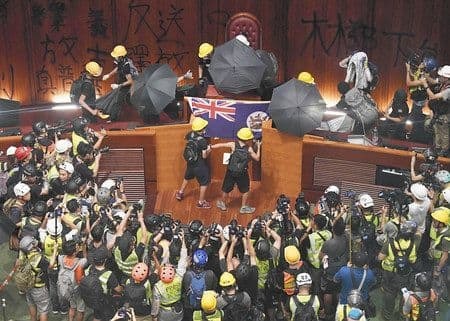 2014年、香港特別行政区立法会議場を占拠する「民主化」デモ隊