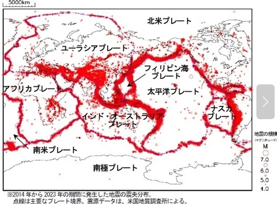 日本がいかに地震が多い国かということは次の地図を見ると一目瞭然(いちもくりょうぜん)だ。この地図は過去10年間に発生した地震の分布を記したものだが、日本列島からフイリピン、インドネシア、南太平洋へ連なる地域は、世界で最も地震が発生しやすい震源域だ。この地域には原発を作って安全な場所などどこにもない。日本はすべての原発を直ちに止め、廃炉作業にとりかかるべきだ。