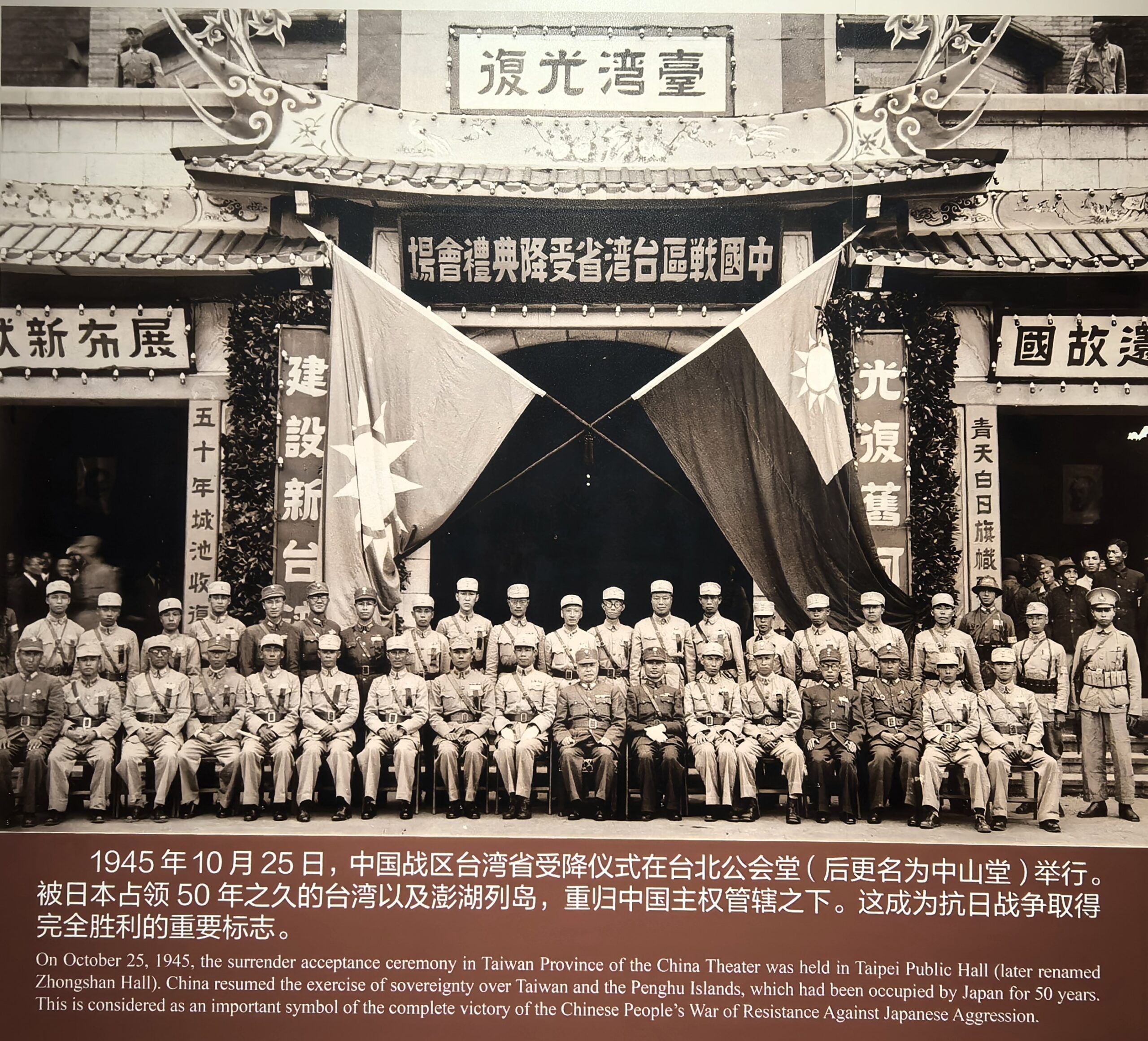 近代日本が最初に獲得した植民地である台湾が中国に返還されたのも80年前である(写真2)。二度と植民地支配をしないと反省し、実践することが、過去との決別=未来志向を意味する。ところが、政治協商会議での正当な手続きを経て政権移行した中華人民共和国を長らく承認せず、内戦に敗れ台湾に逃れた蒋介石政権と1952年に講和条約を結んだ。これが主権侵害、内政干渉にあたり、国連憲章の原則に反するのは明らかだ。1971年に中華人民共和国が国連での代表権を回復した後も、アメリカと一体になって「一つの中国」原則を曖昧化し、大陸と台湾を政治的に分断させてきた。晩年の安倍元首相が煽った「台湾有事は日本有事」はこの延長上にある。大陸と台湾の分断の遠因となったのは、他でもない日本による台湾の植民地支配である。一切の内政干渉を排し、中国の主権を全面的に尊重することが過去との決別であり、未来志向といえる。現在の日本では、決別すべき過去が、逆に「未来」として立ち現れていないか。